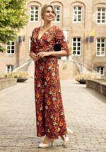 “Draped in aubergine and golden blooms… like a sunset at Woodstock.” De top heeft een vaste overslag, 3/4 mouwen en een super flatterende, geplooide tailleband. Uitgevoerd in een soepele, maar stevige en stretchy stof met een print van retro bloemen in oranje en geeltinten die heerlijk draagt. * Maxi stijl * 3/4 mouwen * Gevoerde top * Blinde rits achterzijde * Reikt tot aan de grond bij een lengte van 1,70 m