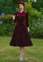 “Velvet dreams, timeless schemes!” Voel je onweerstaanbaar vrouwelijk in deze bordeauxrode velvet swing jurk. Ze heeft een elegante strik in de hals, een flatterende tailleband en een zwierige swingrok die sierlijk met je meebeweegt bij elke stap. Uitgevoerd in een zachte stofmix met de luxe look en feel van fluweel, die soepel valt en heerlijk comfortabel draagt. Perfect voor een chique avondje uit of een feestelijke gelegenheid waarin je wilt stralen. * Swing stijl * Vaste strikbanden * 3/4 pofmouwen * Zijwaartse steekzakjes * Blinde rits zijkant * Barinovael is 1,67 m: haar pumps en accessoires zijn haar eigen vintage treasures