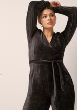 ”Chic, sleek & a little mystique.” Deze stijlvolle jumpsuit ademt pure seventies glamour. Ze heeft lange, licht poffende mouwen en elegante wijde pijpen die zorgen voor een sierlijk silhouet. De subtiele goud-gele print komt prachtig tot leven op de fluweelachtige zwarte stofmix, die zacht aanvoelt en licht meerekt voor een comfortabele pasvorm. * Jumpsuit * V-halslijn met vaste overslag * Lange pofmouwen * Vaste strikbanden voor een ‘snatched’ taille * Geen rits of knopen; aantrekken en ready to go! * It has pockets! * Lange wijde pijpen
