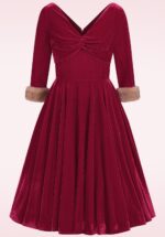 “All eyes on you, darling!” Deze prachtige fluwelen swingjurk is het toppunt van old-school glamour! Ze heeft een elegante V-halslijn met een verfijnd gedraaid detail bij de buste dat je silhouet prachtig accentueert. De afneembare imitatiebont biezen langs de mouwtjes zorgen voor die onweerstaanbare Hollywood touch — perfect voor feestelijke gelegenheden. Ze is uitgevoerd in een zachte, stretchy fluwelen stofmix in een rijke rode tint die heerlijk draagt én je laat stralen bij elke stap. * Swing jurk * V-halslijn met gedraaid detail * 1/2 mouwtjes met afneembare imitatiebont manchetten * Rits- en haaksluiting achterzijde * Reikt bij een lengte van 1,70 m over de knie