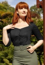 ”Chic and sharp!” Voel je op en top vrouw in Katty! Ze is door onze eigen in-house designers ontworpen en exclusief bij Topvintage verkrijgbaar! Ze heeft een diamantvormige halslijn met een puntig kraagje, 3/4 mouwen en een knopenreeks. Uitgevoerd in een stevige maar soepele, zwarte katoenmix met een lichte stretch waardoor ze heerlijk draagt. ”Elegance with a little edge!” * Diamantvormige halslijn * Licht getailleerd * Puntig kraagje * 3/4 mouwtjes * Knopenreeks voorzijde * Lang genoeg om op een normale heupbroek te dragen * Exclusief bij Topvintage verkrijgbaar
