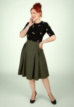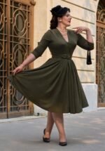 “Vintage flair with a modern twist!” Deze nostalgische swing beauty uit de nieuwe collectie is geïnspireerd op de extraordinaire Marie-Louise Carven; de baanbrekende Franse couturière uit de jaren 40 en 50! Ze heeft een vrouwelijke V-hals, elegante plooitjes bij de schouders en een reeks decoratieve asymmetrische knopen die zorgen voor een speelse retro touch. Vanaf de taille loopt ze uit in een zwierige swingrok die jouw silhouet prachtig flatteert. Uitgevoerd in een zachte, soepele jersey-achtige stofmix met een vleugje viscose (stretchy) in een diepe, saliegroene tint. * Swing model * V-halslijn * Decoratieve knopen aan de voorzijde * 3/4 mouwen * Afneembare riem, voor een extra ‘snatched’ taille * Voorzien van zakken! * Geen rits of knopen; aantrekken en ready to go! * Valt bij een lengte van 1,70 m over de knie
