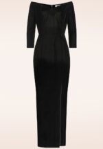 “When glamour calls, she answers in velvet!” Laat je innerlijke diva schitteren in deze betoverende fluwelen maxi jurk. Ze heeft 3/4 mouwen die off-shoulder gedragen kunnen worden en een elegante sweetheart halslijn die een vleugje allure toevoegt. De lange, aansluitende rok met een hoge split creëert een verleidelijke look die bij elke stap in beweging komt. Uitgevoerd in een zachte, stretchy fluweelachtige stofmix die niet alleen luxueus oogt, maar ook heerlijk comfortabel draagt. * Maxi jurk * Subtiele sweetheart halslijn met siliconen biesjes * 3/4 mouwtjes met elastiek die off-shoulder gedragen kunnen worden * Rits- en haaksluiting achterzijde * Voorzien van een hoge split * Reikt bij een lengte van 1,70 m tot aan de enkel