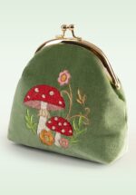 Hoe schattig is dit portemonneetje?! Uitgevoerd in een zacht, groen stofje met de luxe look and feel van fluweel, voorzien van geborduurde paddenstoelen en bloemetjes met ingewerkte glitterdraad. Deze cutie is afgewerkt met een knipsluiting zodat je centjes veilig opgeborgen blijven. * Portemonnee * Knipsluiting * Fluweel * Geborduurd in India