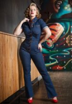Rock-a-Booty staat bekend om haar ‘unique blue dreams’… maar dit is geen droom, deze 50s Gloria Lee Jumpsuit in Denim Blue is echt en kan zomaar van jou zijn! Gloria heeft een puntig kraagje, korte mouwen, opgestikte borstzakjes en koperkleurige knopen waardoor jij zelf kunt bepalen hoeveel van je prachtige decolleté je laat zien. De slanke pijpen lopen iets wijder uit aan de onderkant en laten je benen bovendien eindeloos doen lijken. Ze is uitgevoerd in een prachtige stevige, donkerblauwe katoenmix met een hele fijne stretch waardoor ze je rondingen perfect volgt en is afgewerkt met oranjebruin en rood stikwerk, een koperkleurige rits en opgestikte zakjes voor-en achter voor die authentieke touch. ”Gloria, you make my booty look so fine, I got to make you mine!” * Puntig kraagje * Koperkleurige knopenreeks * Korte mouwen * Opgestikte zakken (voor- en achterzijde) * Authentiek oranjebruin stikwerk * Kenmerkende rode gestikte details * Lange, flared pijpen * Sam Elson (Blossom and Buttercups) is 1,70 m * Onze gorgeous Sophia is 1,68 m