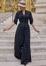 “A tribute to timeless femininity; where soft tailoring meets the romance of Parisian winters.” Deze Camilla jumpsuit uit de nieuwe collectie is geïnspireerd op de extraordinaire Marie-Louise Carven; Een baanbrekende Franse couturière uit de jaren 40 en 50! Ze heeft een flatterend, aansluitend lijfje met plooitjes en 1/2 tulp mouwen. Het lijfje loopt uit in elegante wijde pijpen met plooien, dit zorgt voor een spectaculair silhouet. Uitgevoerd in een stevige maar soepel vallende stofmix in navy met een tartan ruitje (stretcht niet) die heerlijk draagt. * Jumpsuit * V-hals met plooitjes * 1/2 tulp mouwen * Afneembare riem, voor een extra ‘snatched’ taille * Knoopsluiting en verborgen rits en drukknoopjes * It has pockets! * Klepzakjes achterzijde * Lange, wijde pijpen