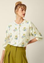 Speels, lief en helemaal retro! Deze kortere blouse heeft een klassieke reverskraag met geschulpte biezen, korte mouwen met vaste omslagjes en een stoffen knopenrij voor die onweerstaanbare vintage uitstraling. Gemaakt van een stevige maar luchtige 100% katoen, met een lieflijk blauw bloemenpatroon op crèmekleurige achtergrond dat je look romantisch en elegant maakt. * Korter model * Revers kraag met geschulpte biezen * Korte mouwen met vaste omslagjes * Stoffen knopenreeks
