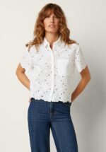 “When classic meets a little romance.” Deze beauty heeft een puntig kraagje, korte mouwen, een knopenreeks en een borstzakje aan de voorzijde. Ze is uitgevoerd in soepele en luchtige Bio katoen (stretcht niet) in wit en is voorzien van een all-over opengewerkt broderie anglaise bloemenpatroon voor een elegante finishing touch. * Puntige kraag * Knopenrij * Korte mouwen * Voorzien van borstzakje * Lang genoeg om op een normale heupbroek te dragen