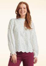 Wat een plaatje, deze Julie blouse! Ze is uitgevoerd in een luchtige, witte katoenmix, waardoor ze heerlijk comfortabel draagt. Bovendien is ze afgewerkt met prachtige geborduurde bloemen en kanten details. * Loose-fit model * Hoog, iets opstaand kraagje * Lange wijde pofmouwen met elastiek * Lang genoeg om op een normale heupbroek te dragen