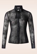 ”Living that spiderific life!” Deze black beauty heeft een puntige kraag, lange mouwen en een afneembaar strikdetail rond de hals. Ze is uitgevoerd in een soepele en doorschijnende, zwarte mesh (stretchy!) voorzien van een fluweelachtige spinnenweb print. * Puntig kraagje * Afneembaar strikdetail * Lange mouwen * Knopenrij * Lang genoeg om op een normale heupbroek te dragen