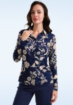 “Nature-inspired elegance, sustainably made.” Deze blouse heeft een fantastische print van kraanvogels en bloemen in crème! Uitgevoerd in een super zachte, soepele en stretchy EcoVero viscosemix in navyblauw die heerlijk draagt. * V-halslijn * Revers kraagje * Lange mouwen * Knopenrij * EcoVero * Lang genoeg om op een normale heupbroek te dragen