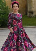 “Wearing this floral dress is like being hugged by a garden, minus the thorns!” 😉 Uitgevoerd in een stevige maar toch soepele zwarte katoenmix met een fijne stretch voorzien van een prachtige bloemenprint die heerlijk draagt. * Vierkante halslijn * 3/4 mouwen * It has pockets! * Blinde ritssluiting achterzijde * Te combineren met een petticoat voor een extra feestelijk effect * Valt bij een lengte van 1,70 m over de knie
