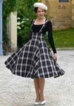 “Plaid perfection with a playful swing!” Deze pinafore rok wordt heel hoog in de taille gedragen vanwaar ze uitloopt in een zwierige swing rok waardoor er een super vrouwelijk silhouet ontstaat. Uitgevoerd in een stevige maar soepele, zwarte stof met een tartan ruitje in rood en wit. * Swing stijl * Zijwaartse steekzakken * Verstelbare schouderbanden * Blinde rits achterzijde * Kan gecombineerd worden met een van onze petticoats * Valt bij een lengte van 1,70 m over de knie