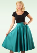 Met deze Michaella Full Swing Skirt in Teal ben je in voor een feestje! Deze prachtige full swing rok wordt hoog in de taille gedragen en kan gecombineerd worden met een petticoat voor een extra feestelijk effect 😉 Ze is uitgevoerd in een stevige maar soepel vallende, glanzende tealgroene stof (stretcht niet) voor een luxe uitstraling. Voetjes van de vloer and twirl baby girl… met Michaella in je kast laat je nooit meer een feestje schieten! * Full swing rok * Zijwaartse steekzakjes * Kan gecombineerd worden met een petticoat voor een extra feestelijk effect * Blinde rits en haaksluiting achterzijde * Onze gorgeous blondine Rachel is 1,72 m
