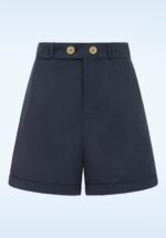 De zomer komt er aan, tijd om je beentjes te showen! Dit retro modelletje draag je hoger in de taille en heeft korte pijpjes afgewerkt met een speels omslagje die super flatterend staat bij zowel dames met slanke benen als dames met curvy benen 😉 Uitgevoerd in een stevige maar aangename, navyblauwe viscosemix (stretcht amper) dat perfect is voor het aankomende seizoen. ”Life’s too short, to not wear shorts!” * Hoog taille model * Knoop- en ritssluiting voorzijde * Riemlussen * Zijwaartse steekzakken * Ietwat wijdere pijpjes * Omslagjes