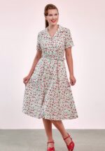 “Blooming with vintage colour.” Deze doorknoop swing jurk heeft een elegante V-halslijn, reverskraagje, korte mouwen en loopt uit in een prachtige swing rok voor een super vrouwelijk silhouet. Uitgevoerd in een stevige, maar soepele 100% katoen (stretcht niet) in crème met een kleurrijke bloemetjesprint. * Swing model * V-halslijn * Reverskraagje * Korte mouwtjes met omslagjes * Reeks knopen tot de zoom * Afneembare riem * Zijwaartse steekzakken * Valt bij een lengte van 1,70 m tot halverwege de kuit * Let op; de kleur van het product op de video kan afwijken van de daadwerkelijke kleur van het product