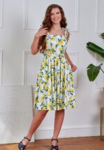 ”Flowers, the ultimate mood-lifter!” Jamie is uitgevoerd in een stevige, maar soepel vallende, witte katoenmix met een gele bloemenprint en voorzien van een lichte stretch voor een heerlijk draagcomfort. * Full swing * Hoge halslijn * Zijwaartse steekzakken * Combineer met een van onze petticoats voor een extra feestelijk effect * Blinde rits aan de zijkant * Valt bij een lengte van 1,70 m over de knie