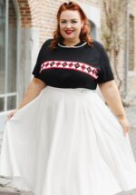 “For the women who turn moments into history.” Dit fifties pareltje is voorzien van sierknoopjes bij de taille, vanwaar zij uitloopt in een klassieke, elegante full swing rok. Uitgevoerd in een stevige maar soepel vallende stof in gebroken wit (stretcht amper) met de look and feel van luxe satijn. * Full swing rok * Sierknoopjes * Zijwaartse steekzakken * Rits- en haaksluiting achterzijde * Kan gecombineerd worden met een van onze petticoats * Valt bij een lengte van 1,70 m over de knie * Katrin is 1,69 m