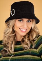 Tijdens de jaren 20 en 30 verliet geen enkele vrouw ooit het huis zonder een chique cloche, om haar look af te maken! Waarom nu niet meer? Een mooie tas, geweldige schoenen en een prachtige wintermantel… maar deze 30s Esme Cloche Hat in Black maakt het plaatje pas echt compleet! Uitgevoerd in een mooie kwaliteit, zacht, zwart ribfluweel met een rand die naar beneden buigt, een chenille band met een subtiele glitter en een opvallende ‘broche’ applicatie voorzien van ‘faux’ parels en strass steentjes. Zie er stijlvol uit… van teen tot top! 😉 * Cloche hat * Nauwsluitende fit * Zacht en warm * Chenille band * Strass * ‘Faux’ parels * Verstelbaar d.m.v. koordje binnenzijde