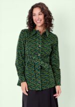 “A statement in motion… ribbed texture meets bold retro greens and blues for a look that’s effortlessly iconic!” Deze jacket stijl blouse is uitgevoerd in een stevige maar stretchy, subtiele ribfluwelen katoenmix voorzien van een grafische retro print in groen- en blauw tinten. * Puntig kraagje * Lange, licht poffende mouwen met manchet * Reeks knopen voorzijde * Met zakken! * Afneembare strikband voor een extra ‘snatched’ taille * Lang genoeg om op een normale heupbroek te dragen