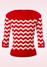 Feel the sixties vibe met deze Vanilla Top in Red and White! Eenvoudig maar toch speciaal door de lieflijke details! De top heeft een mooie ”slash” halslijn en mouwtjes met splitjes die afgezet zijn met kleine strikjes, só cute! Uitgevoerd in een heerlijke soepele, stretchy, lipstickrode viscosemix met een wit zigzagpatroon die zijn perfecte pasvorm zal blijven behouden, zelfs na een aantal wasbeurten. Een veelzijdige top die niet mag ontbreken in de kast van een retro loving lady 😉 * ”Slash” halslijn * 3/4 mouwtjes met splitjes * Vaste strikjes * Geschulpte zoom * Lang genoeg om op een normale heupbroek te dragen