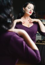 Vrouwelijk en flirty is deze Ruby swing jurk in aubergine! Wow, wat een schoonheid! Deze vintage geïnspireerde beauty heeft een elegante diamantvormige halslijn, een brede tailleband en flatterende plooitjes die sierlijk doorlopen naar de buste. De semi-swing rok in combinatie met de aansluitende top geeft jou een super vrouwelijk fifties silhouet. Uitgevoerd in een stevig, maar soepel en stretchy aubergine gekleurd stofje dat heerlijk draagt. Dit jurkje zal je hart veroveren, en niet alleen die van jou… 😉 * Semi-swing model * Diamantvormige halslijn * 3/4 mouwen * Blinde rits achterzijde * Valt bij een lengte van 1,70 m over de knie