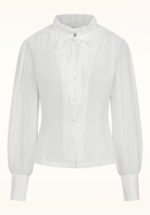 ”Stay classy… stay fabulous!” Deze klassieke beauty heeft vaste strikbanden, lange pofmouwen met manchetten en schattige bloemvormige knoopjes. Ze is uitgevoerd in een soepele en licht stretchy witte stof voorzien van een structuur van kleine dotjes. * Klein opstaand kraagje * Vaste strikbanden * Lange pofmouwen met manchetten * Bloemvormige knopen * Lang genoeg om op een normale heupbroek te dragen * Let op; de kleur van het product op de video kan afwijken van de daadwerkelijke kleur van het product