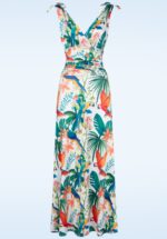”Feathered fiesta in full swing!” Vier de zomer in deze geweldige maxi jurk! Ze heeft een overslag top met speelse vaste strikbandjes op de schouders, een super flatterende geplooide tailleband en loopt vanaf daar uit in een flowy maxi rok. Ze is uitgevoerd in een soepel, stretchy slinky wit stofje met een fantastische tropische print met bladeren, bloemen en papagaaien. * Maxi jurk * Gevoerd voor extra comfort * Vaste overslag * Vaste strikbandjes * Super flatterende, geplooide tailleband * Geen rits of knopen; aantrekken en ready to go! * Reikt bij een lengte van 1,70 m tot aan de grond