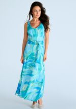 ”Watercolour tones, drifting in effortless elegance.” Deze maxi beauty is stunning om te zien en ontzettend comfortabel dankzij de soepele en stretchy, gladde slinky stof met StayFresh coating voorzien van een aquarel-achtige print in blauw en groentinten. * Maxi jurk * V-hals en V-rug * Mouwloos * Volledig gevoerd * Afneembare strikriem, voor een extra ‘snatched’ taille * Geen rits of knopen; aantrekken en ready to go! * Valt bij een lengte van 1,70 m tot op de enkel * StayFresh coating