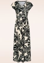 “Bold lines, bold vibes.” Deze groovy midaxi jurk is uitgevoerd in een stretchy en zachte stofmix voorzien van een grafische print van bladeren in zwart en gebroken wit. * V-hals * Overslag met verborgen drukknoopje * Korte kapmouwtjes * Afneembaar striklint voor een extra ‘snatched’ taille * Geen rits of knopen; aantrekken en ready to go! * Valt bij een lengte van 1,70 m tot halverwege de kuit
