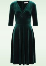 Deze Maddison swing jurk is een droom van een jurk! Deze beauty heeft een elegante geplooide overslag, 3/4 mouwen en een brede tailleband die je taille perfect benadrukt. Vanaf de taille loopt ze uit in een zwierige swing rok waardoor er een super vrouwelijk silhouet ontstaat. Uitgevoerd in een soepele en stretchy, zachte, flessengroene fluwelen stof die heerlijk draagt. “Stop dreaming and start ordering!” * Swing model * Gevoerde top * Vaste geplooide overslag * 3/4 mouwen * Brede tailleband * Blinde rits achterzijde * Exclusief bij Topvintage verkrijgbaar * Valt bij een lengte van 1,70 m over de knie