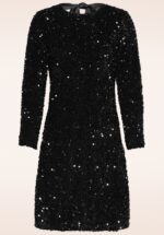 “Celebrate yourself, steal the spotlight.” Deze party-proof A-lijn jurk is uitgevoerd in een fluweelachtige, zwarte stof met een lichte stretch, bezaaid met pailletten en een strik aan de achterzijde. * A-lijn * Hoge, ronde halslijn * Zwart strikdetail achterzijde * Geen rits- of knoopsluiting; aantrekken en ‘ready to party’ * Volledig gevoerd * Reikt bij een lengte van 1,70 m tot net boven de knie