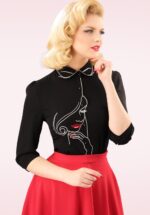 Deze Model Face Blouse in Black laat je hartje sneller kloppen! ”If you can’t see anything beautiful in yourself, get a better mirror!” Deze beauty heeft een afgerond kraagje met wimpers, 3/4 pofmouwen en een reeks glanzende knopen. Uitgevoerd in een soepel, semi-doorschijnend, zwart, crêpe-achtig stofje (stretcht niet!) met prachtige applicaties aan zowel de voor- als achterkant. ”This is your moment, own it!” * Afgerond kraagje * 3/4 pofmouwen * Reeks glanzende knopen