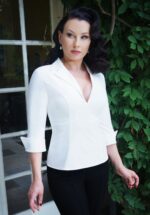 ‘Dress how you want to be addressed! ‘Boss Lady’ will do just fine!’ 😉 Jij hebt de touwtjes in handen als je deze veelzijdige Dianne Blouse in Crispy White draagt! Ook dit seizoen voorzien onze in-house designers ons weer van draagbare en klassieke items met een hypervrouwelijk silhouet voor alle ”Power Women”. Deze licht getailleerde classy blouse heeft het comfort van een top en is afgewerkt met een puntig revers kraagje en 3/4 mouwtjes met puntige omslagjes. Uitgevoerd in een stevige maar toch soepele ivoorwitte stof met een hele lichte stretch die heerlijk draagt! * Blouse * Licht getailleerd * Puntig revers kraagje * Gevoerd bij de buste (voorkomt doorschijnen) * 3/4 mouwtjes met puntige omslagjes * Blinde rits achterzijde * Lang genoeg om op een normale heupbroek te dragen * Femme fatale Eden Berlin is 1,68 m: haar pumps en accessoires zijn haar eigen treasures