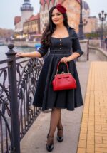 ”Gentlemen may prefer blondes, but we prefer this Lorelei Swing Dress on you!” De inspiratie van onze in-house designers dit seizoen was ”Bright Dreams in Neon Lights”. Maar het blijft niet bij dromen want deze collectie is als een droom die ook daadwerkelijk uitkomt! Deze show stopping, op Marilyn Monroe geïnspireerde swing dress is uitgevoerd in een zwarte stof met een lichte stretch die elegant met je mee beweegt. “I don’t want to be looked at. I want to be noticed.” * Swing stijl * Rechte halslijn met baleinen * Opstaand, puntig kraagje * 3/4 mouwtjes met puntige omslagjes * Gevoerde top * Afneembare riem, voor een extra ‘snatched’ taille * Voorzien van zakken! * Blinde rits aan de achterzijde * Gorgeous Rachel is 1,72 m: haar pumps en accessoires zijn haar eigen vintage treasures