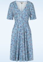 ”My love for flowers is blooming ridiculous!” Deze prachtige swing beauty heeft een elegante V-halslijn, korte mouwen en loopt uit in een prachtige swing rok, die jou een prachtig vrouwelijk silhouet geeft! Uitgevoerd in een stevige, maar soepele en luchtige, lichtblauwe katoenmix voorzien van een bloemenprint in donkerblauw en crème. * Swing model * V-halslijn * Korte mouwen * Reeks knopen * Zijwaartse steekzakken * Valt bij een lengte van 1,70 m tot halverwege de kuit