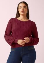 De combinatiemogelijkheden zijn eindeloos met een beauty als deze! Ze is uitgevoerd in bordeauxrood 100% bio katoen met een opengewerkt patroon dat heerlijk soepel en luchtig draagt. Waar ga jij haar mee combineren? 😉 * Lange pofmouwen * Opengewerkt patroon * Stretchy ribboorden * Lang genoeg om op een normale heupbroek te dragen