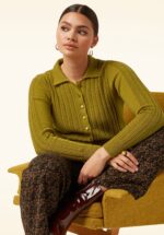 “Where comfort meets timeless charm!” Laat de zon in je garderobe schijnen met dit prachtige vestje in currygeel. Ze heeft een puntig kraagje, lange mouwen en een verfijnd opengewerkt patroon dat die typische seventies flair toevoegt. Uitgevoerd in een zachte katoenmix met een vleugje kasjmier voor extra luxe en draagcomfort. Perfect om je look een zonnige, retro touch te geven – zelfs op de koelere dagen! * Vest * Puntig kraagje * Lange mouwen * Opengewerkt patroon * Knopenreeks * Stretchy ribboorden * Lang genoeg om op een normale heupbroek te dragen