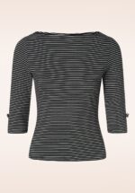 Elegant en schattig deze Simply Stripe Top in Black! Eenvoudig maar toch speciaal door haar lieflijke details. De top heeft een mooie ‘slash’ halslijn en mouwtjes met splitjes die afgezet zijn met kleine strikjes, sĂł cute! Uitgevoerd in heerlijk soepel, stretchy, zwart katoen met witte streepjes, die zijn perfecte pasvorm zal blijven behouden, zelfs na een aantal wasbeurten. Een veelzijdige classy top die niet mag ontbreken in de kast van een echte vintage lady đ  * ‘Slash’ halslijn * 3/4 mouwtjes * Vaste strikjes * Lang genoeg om op een normale heupbroek te dragen