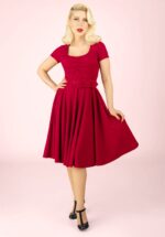 ”Embracing the power of red!” Deze Darlene swing jurk uit de nieuwe Topvintage Boutique Collection is door onze eigen in-house designers ontworpen en exclusief bij Topvintage verkrijgbaar! Darling Darlene heeft een scoop halslijn met flatterende plooitjes, korte mouwtjes en loopt vanaf de taille uit in een volle swing rok. Ze is uitgevoerd in een gladde en soepel vallende, dieprode stof die licht stretcht waardoor ze heerlijk draagt. She’s sassy but classy! * Full swing model * Scoop halslijn met plooitjes * Korte mouwtjes * Bra strap holders zodat je bh bandjes niet gaan schuiven * Gevoerde top * Afneembare riem voor een extra ‘snatched’ taille * It has pockets! * Blinde rits achterzijde * Gorgeous Julia Fiore (Fiorevanil) is 1,70 m; haar pumps zijn haar eigen vintage treasures * Exclusief bij Topvintage verkrijgbaar
