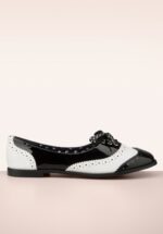Deze veelzijdige 60s Old Soul Dancer Shoes in White and Black zullen je nieuwe, favoriete platte schoenen worden! Deze opvallende ‘saddle shoes’ in retro jaren 50 – 60 stijl zijn het perfecte alternatief als je je favoriete heels eens een dagje rust gunt 😉 Uitgevoerd in topkwaliteit crèmekleurig en zwart faux leder in brogue stijl met een vetersluiting en een opvallende zool in contrasterend rood. De heerlijk zachte binnenzool en de dikkere, comfortabele buitenzool zorgen er samen voor dat je je hakken misschien wel langer dan een dag in de kast gaat laten staan 😉 Want ondanks haar klassieke uiterlijk geven deze schoenen al je retro (party) outfits toch nét iets extra’s!  * Saddle shoe * Rond neusje * Comfortabel voetbed * Stevige zool * Anti-slip zool