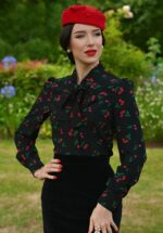 “Where classic black meets the charm of cherry delight.” Deze blouse is licht getailleerd en afgewerkt met speelse strikbandjes, stoffen knoopjes en lange, licht poffende mouwen. Ze is uitgevoerd in een soepel zwart structuur stofje (stretcht amper!) met rode kersjes all-over. * Licht getailleerd model * Vaste strikbanden * Stoffen knopenrij * Lange, licht poffende mouwen met manchetten * Lang genoeg om op een normale heupbroek te dragen