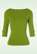Deze Oonagh Top in Olive Green is eenvoudig maar toch speciaal door de lieflijke details! De top heeft een mooie ”slash” halslijn en mouwtjes met splitjes die afgezet zijn met kleine strikjes, só cute! Uitgevoerd in heerlijk soepel en stretchy, olijfgroen katoen die zijn perfecte pasvorm zal blijven behouden, zelfs na een aantal wasbeurten. Een veelzijdige classy top die niet mag ontbreken in de kast van een echte vintage lady 😉 * ”Slash” halslijn * 3/4 mouwtjes * Vaste strikjes * Lang genoeg om op een normale heupbroek te dragen