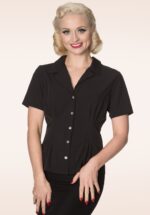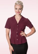 Add a touch of vintage romance to your wardrobe with Sarah Bo! Deze beauty uit de nieuwe collectie van Miss Candyfloss is geïnspireerd op de extraordinaire Marie-Louise Carven — een baanbrekende Franse couturière uit de jaren ’40 en ’50. De hoge halslijn met een delicate strik straalt tijdloze charme uit, terwijl het getailleerde lijfje je silhouet prachtig benadrukt. Ze heeft tevens elegante, doorschijnende bisschopsmouwen met manchetten en is uitgevoerd in een soepele stofmix in een rijke wijnrode kleur, met een lichte stretch voor optimaal draagcomfort. * Getailleerd model * Gevoerd m.u.v. de mouwen * Vaste strikbanden * Knopenreeks * Lange bisschopmouwen met manchetten * Lang genoeg om op een normale heupbroek te dragen