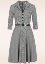 ”Pied de poule reinvented in swing perfection.” Deze classy semi swing beauty is uitgevoerd in een stevige maar stretchy stof met een zwart/wit pied de poule motief die heerlijk draagt. * Swing model * Puntig kraagje * Sierknopen * 3/4 mouwen * Afneembaar lakriempje, voor een extra ‘snatched’ taille * Met zakken! * Blinde rits achterzijde * Valt bij een lengte van 1,70 m net over de knie