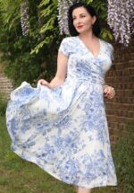 Deze elegante Layla Cross Over Dress is een echte vintage beauty die perfect is voor elke gelegenheid! Zoals de bekende song van Eric Clapton; “Layla, you’ve got me on my knees”, wauw wat een beauty! De aansluitende top heeft een prachtige V-halslijn, mooie overslag, speelse strikbandjes die je zowel los als gestrikt kunt dragen en flatterende plooitjes aan de zijkant. Uitgevoerd in een gladde, soepele en stretchy slinky stof in navyblauw met een speels printje in gebroken wit. Layla, we’re in love! * Vaste overslag * Korte mouwtjes * Strikbandjes * Semi-swing stijl * Geen rits of knopen * Valt bij een lengte van 1,70 m over de knie * Exclusief bij Topvintage verkrijgbaar