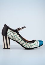 ”Life isn’t perfect, but your shoes can be!” Deze pumps in Mary Jane stijl zijn uitgevoerd in een combinatie van zwart leder, blauw lakleder en een gedeelte in crème met een grafisch printje. Maar de echte eyecatcher is toch wel de hoge blokhak in hout-look voorzien van opvallende zwart/witte strepen. * Mary Jane stijl * Verstelbaar enkelbandje * Echt leder/lakleder * Rond neusje * Stevige, hoge blokhak * Comfortabel voetbed van leder * Anti-slip zool * Deze kleurcombinatie is speciaal ontworpen voor Topvintage