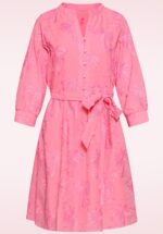“Feeling palm-tastic today!” Deze roze a-lijn jurk is een frisse, zomerse must-have! Ze heeft een losse, comfortabele fit, 3/4 wijde pofmouwen en functionele knopen aan de voorzijde. De geborduurde palmbomen geven haar een speelse tropical twist en doordat ze is uitgevoerd in 100% katoen, draagt ze heerlijk luchtig en ademend. * V-hals * Knopenreeks * Gevoerd * 3/4, wijde pofmouwen * Afneembaar striklint, voor een extra ‘snatched’ taille * Valt bij een lengte van 1,70 m boven de knie
