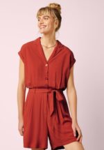 “One piece, endless sunshine vibes.” Deze fabulous playsuit is jouw go-to voor zonnige dagen! Ze heeft korte kapmouwtjes, zwierige wijde pijpen en een afneembaar striklint dat je taille prachtig accentueert. Uitgevoerd in een soepele en luchtige donkeroranje viscose met een subtiele structuur, die heerlijk comfortabel draagt én zorgt voor die instant summer glow. * Playsuit * Revers kraag * Korte kapmouwtjes met vaste omslagjes * Knopenreeks * Rits met knoopsluiting * Afneembare strikband voor een extra ‘snatched’ taille * It has pockets! * Korte, wijde pijp