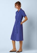 “Soft shine, strong style.” Deze midi doorknoopjurk is speels én vrouwelijk dankzij de top met puntig kraagje, korte mouwen en het afneembare striklint dat je taille prachtig accentueert. Ze is uitgevoerd in een heerlijk soepele EcoVero viscosemix in Amaro blauw (stretcht niet), met een subtiele satijnachtige look & feel en een fijn structuurtje. * Midi model * Doorknoopjurk * Puntig kraagje * Korte mouwen * Afneembare strikband voor een extra ‘snatched’ taille * It has pockets! * Reikt bij een lengte van 1,70 m tot op de kuit